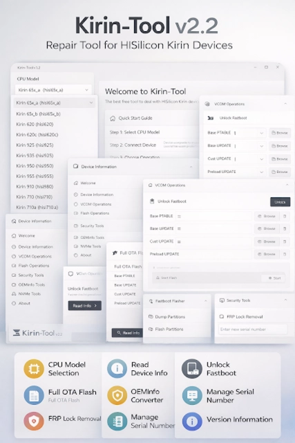 Kirin-Tool v2.2 is a Windows-based mobile repair software designed to work primarily with Huawei and Honor smartphones powered by Kirin processors. The tool focuses on advanced servicing tasks such as: